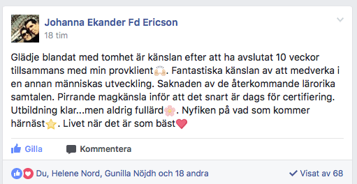 “Glädje blandat med tomhet är känslan efter att ha avslutat 10 veckor tillsammans med en provklient. Fantastisk känslaa att medverka i en annan människas utveckling. Saknaden av de återkommande lärorika samtalen. Pirrande magkänsla inför att det snart är dags för certifiering. Utbildning klar… men aldrig fullärd. Nyfiken på vad som kommer härnäst. Livet när det är som bäst.”